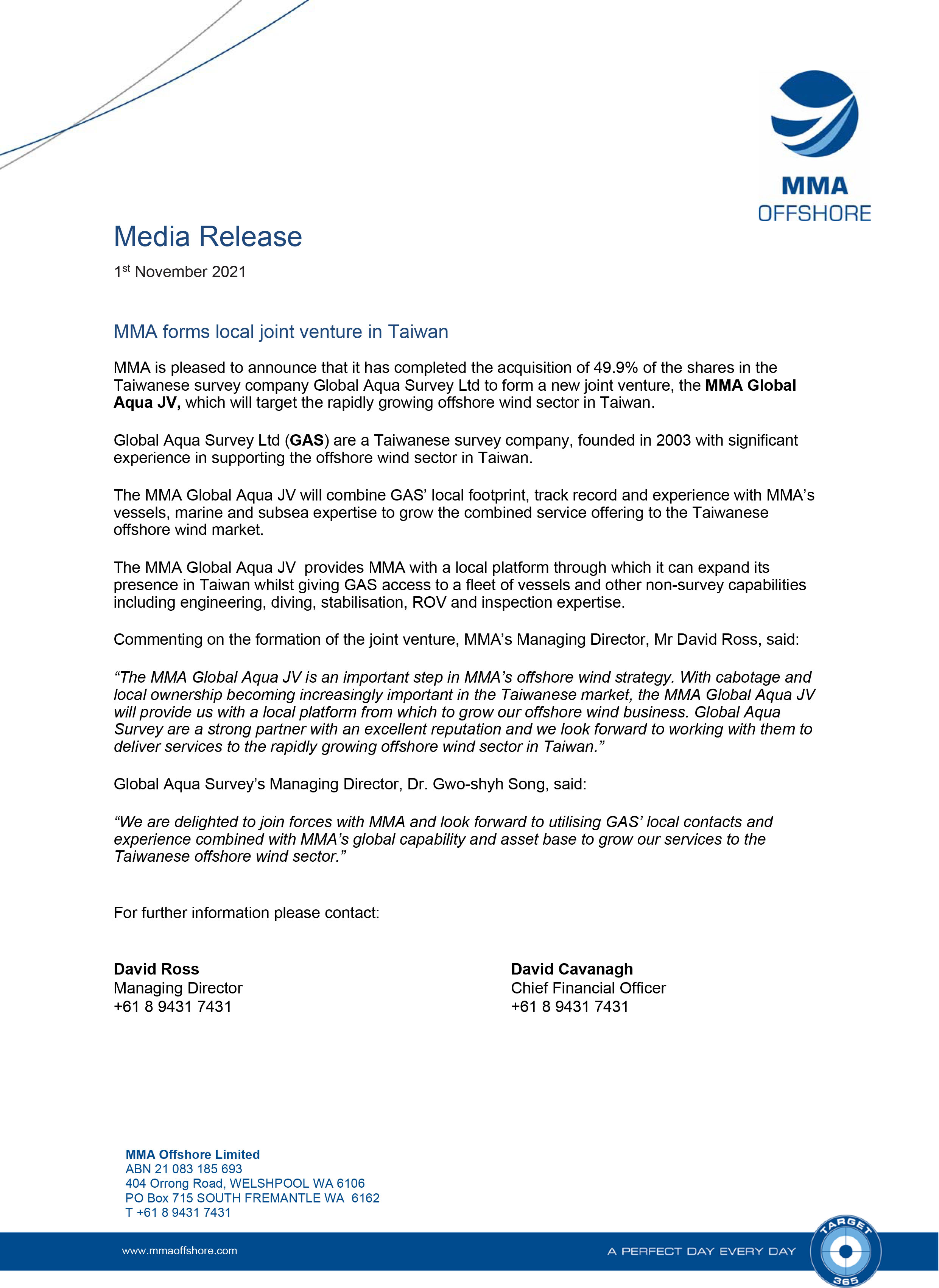 Taiwanese survey company Global Aqua Survey Ltd to form a new joint venture, the MMA Global