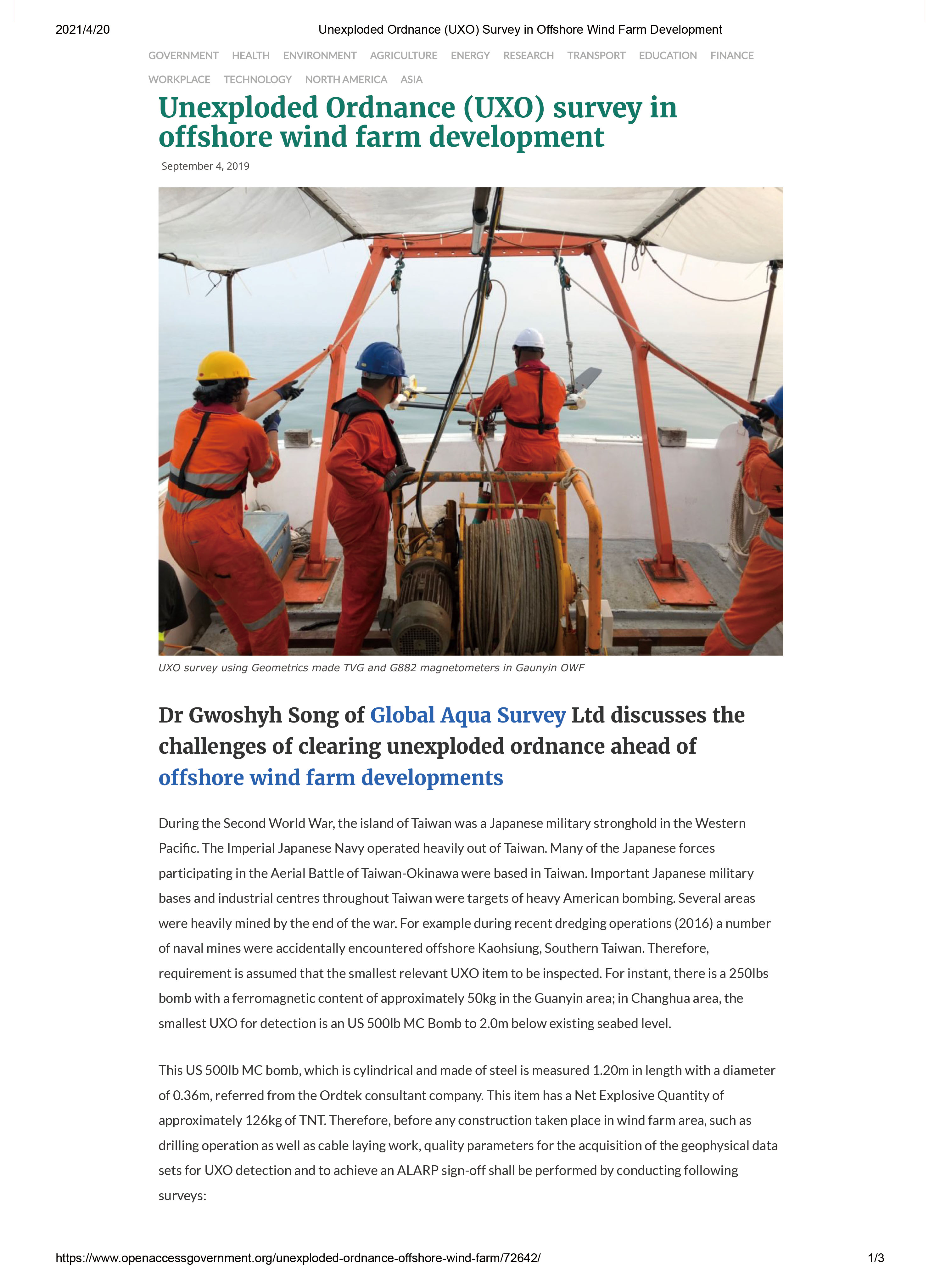 Dr Gwoshyh Song of Global Aqua Survey Ltd discusses the challenges of clearing unexploded ordnance ahead of oʶshore wind farm developments